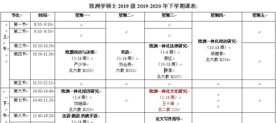 During the second semester of 2019-2020, Prof. WANG offered courses "Western Scosiety and Culture", "Cultural Studies on European Integration" and "Business English Language and Culture" to undergduates and postgraduates respectively.